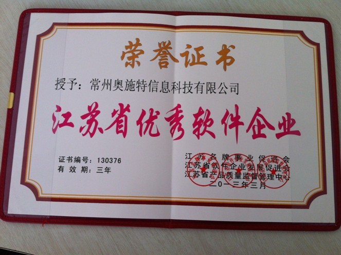 日,常州奧施特公司榮獲江蘇省優(yōu)秀軟件企業(yè)。